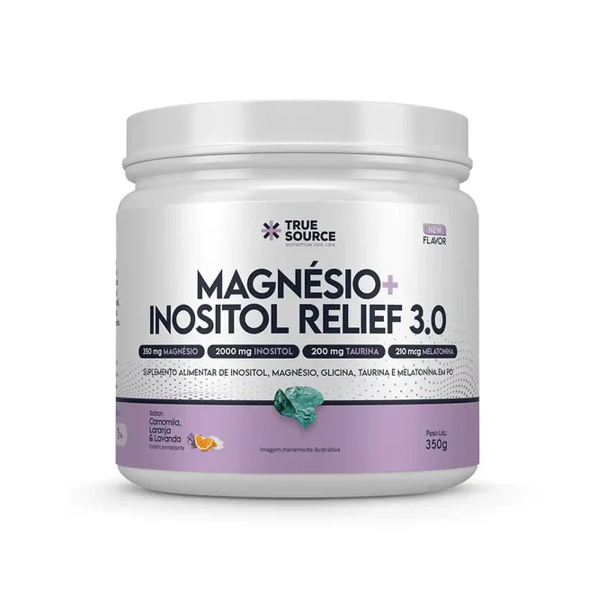 Magnésio + Inositol Relief 3.0 traz uma fórmula avançada com 350 mg de magnésio bisglicinato e 2 g de inositol por porção de 8 g. Enriquecido com taurina (200 mg), glicina (1 g), 210 µg de melatonina, camomila e lavanda em pó, adoçado com stevia e taumatina, e colorido com cúrcuma. Sem glúten, lactose ou açúcares — ideal para consumo ao entardecer, quente ou frio.